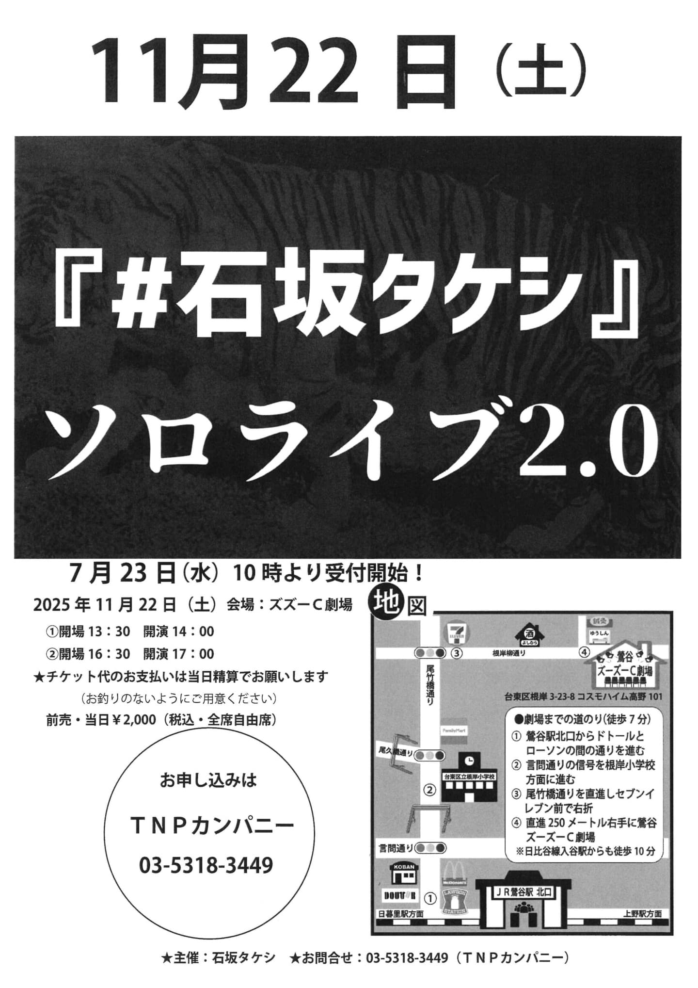 | 2025/02/03 | 4月19日(土) 鶯谷ズーズーC劇場 土谷ひろしLIVE 「未完成 土谷ひろし ぼっちライブ」 詳細はここをクリック |