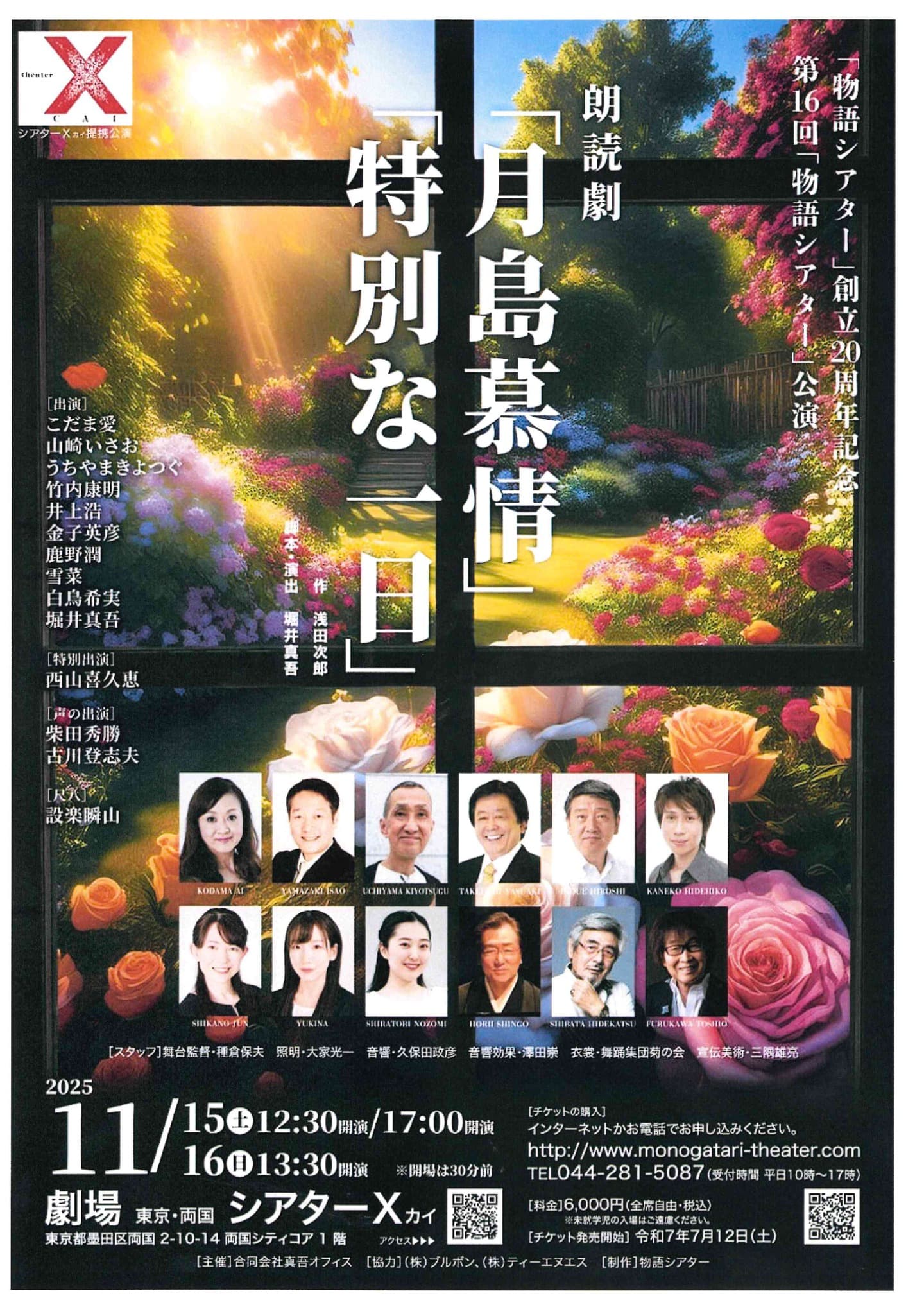 11月15日(土)開演①12:30 ②17:00 11月16日(日)開演13:30 会場:東京両国 シアターX チケット代金:6000円(全席自由) お問合せ先:044-281-5087(平日10時~17時) |